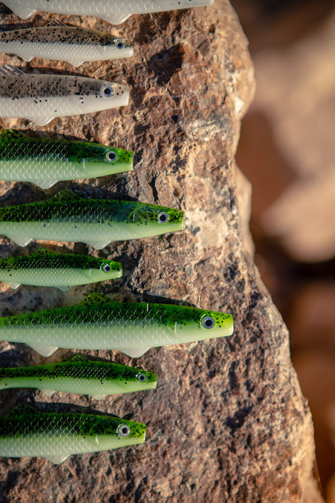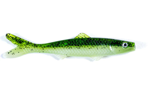 A specially formulated "living plastic" creates the exact spastic action of an injured or dying minnow when swam through water. An action that mimics nature and makes fish bite even when they are not hungry!